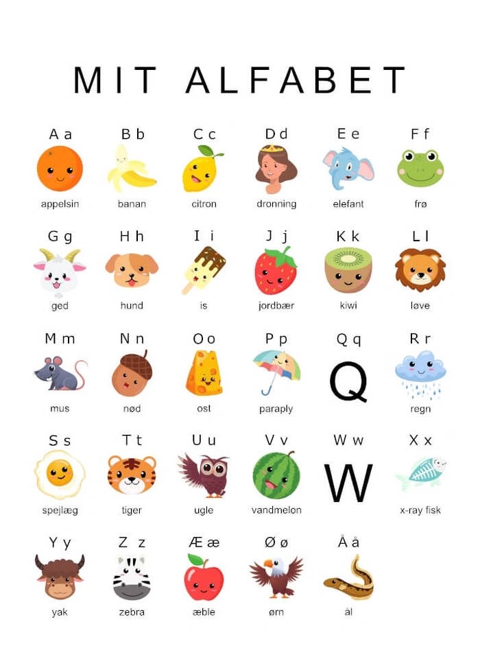 Här har vi designat den sötaste affisch, som snabbt kommer att inspirera ditt barn att lära sig alfabetet. På den här affisch hittar vi såklart alla bokstäverna och varje bokstav har fått en lätt igenkännlig illustration. Varje illustration visar ett djur, en frukt eller något annat som alla barn kan känna igen. På så sätt kan de sitta och öva på att säga namnen högt tills de har lärt sig känna igen alla bokstäver i alfabetet.