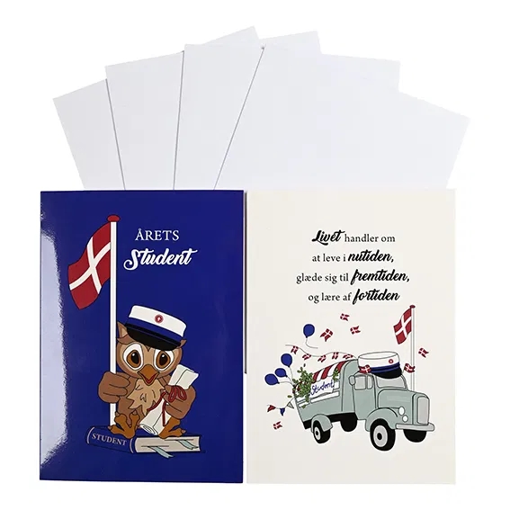 Kortdesignen kombinerar klassiska danska studentikoner med festliga illustrationer. Den charmiga ugglan med studentmössa och den dekorerade lastbilen skapar den rätta atmosfären för firandet. Den blå designen ger ett lugnt och elegant uttryck.